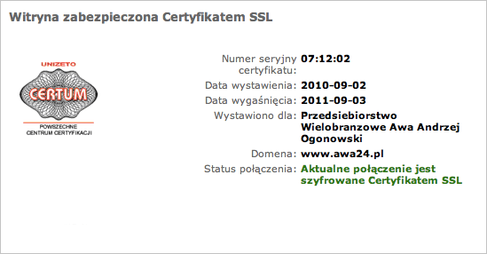 Powyższy obrazek prezentuje zrzut ekranu z dnia 14 września 2010 roku. Aktualny certyfikat możesz sprawdzić klikając na niebieską pieczęć Certum - "Zabezpiecza Certum" - która znajduje się po prawej stronie.